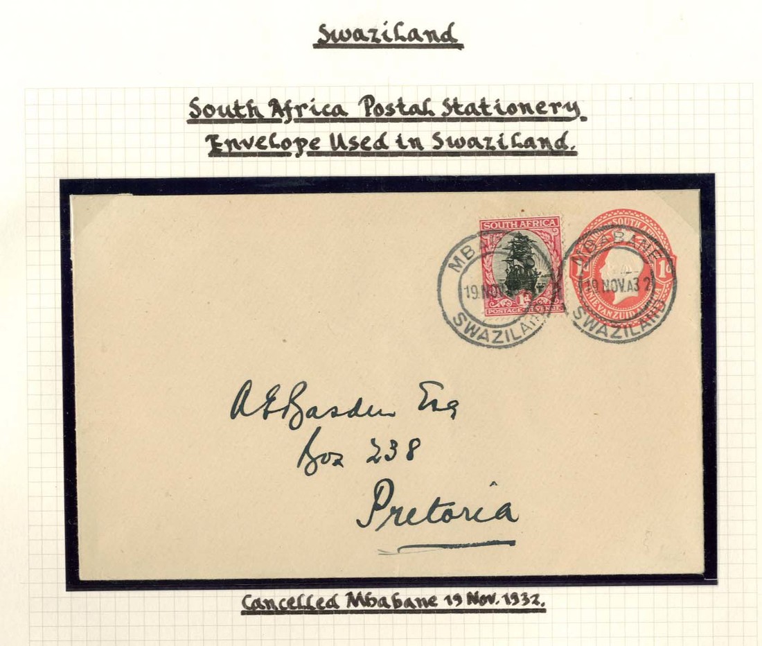 1932 1d. red envelope, uprated with 1d. Ship from Mbabane to Pretoria, 1932 envelope from Mbabane to Pretoria bearing 1931 2d. and 1933 (Jan.) envelope from Bremersdorp to Pretoria bearing 1932 1/- upper right corner pair, fine strikes and an attractive trio