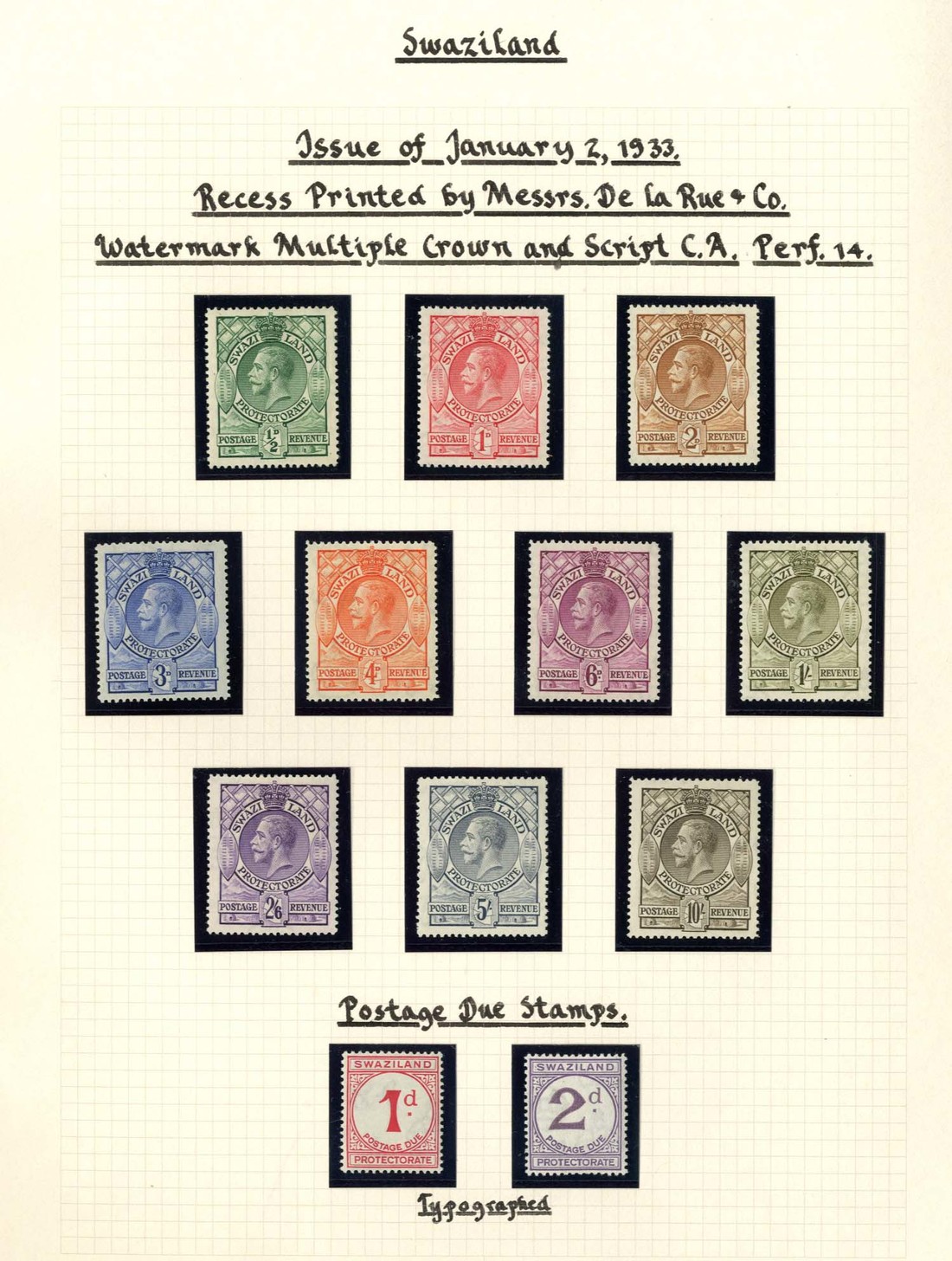 1933-63 largely mint collection with a selection of 1889-90 values (the basic issues (less S.G. 75b) complete, additional items include 1936 envelope from Mbabane bearing 1933 2d., 3d. and 6d., 1943-47 additional perforations, postal stationery items (13, three overprinted "specimen") and KGV Revenues (5); generally good to fine