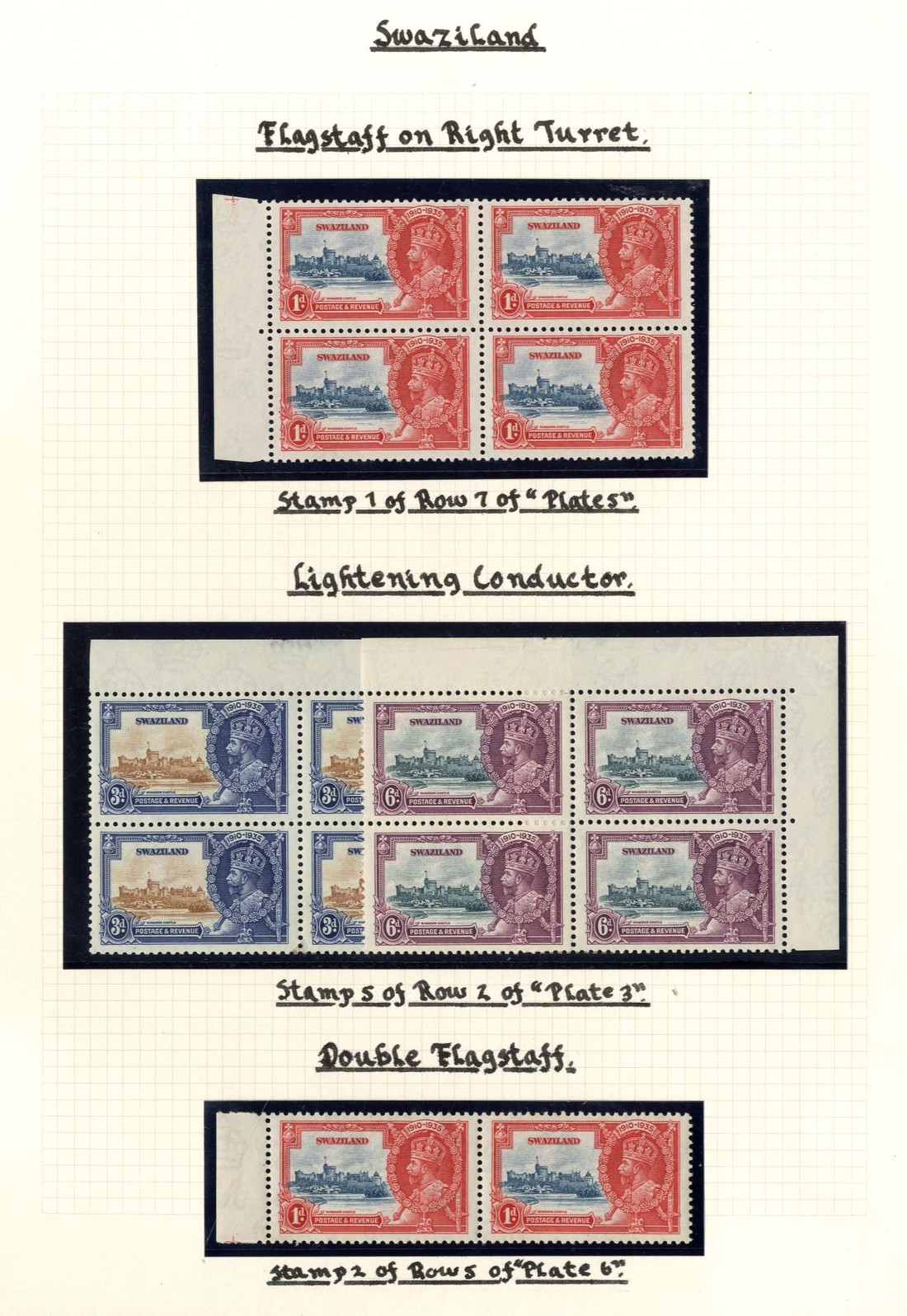1d. marginal block of four with flagstaff on right turret, 1d. marginal pair with double flagstaff, 3d. and 6d. upper right corner blocks of four with lightning conductor, mint; a few small faults though of generally fine appearance. S.G. 21d, 21e, 23c, 24c, £560+