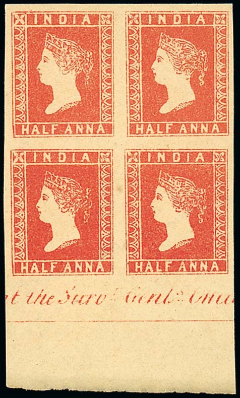 1854 9½ arches essay, vermilion marginal block of four, [106-117]; tone spot between lower impressions, otherwise fine and a scarce multiple. B.P.A. Certificate (2014). S.G.1, £10,000+. Photo