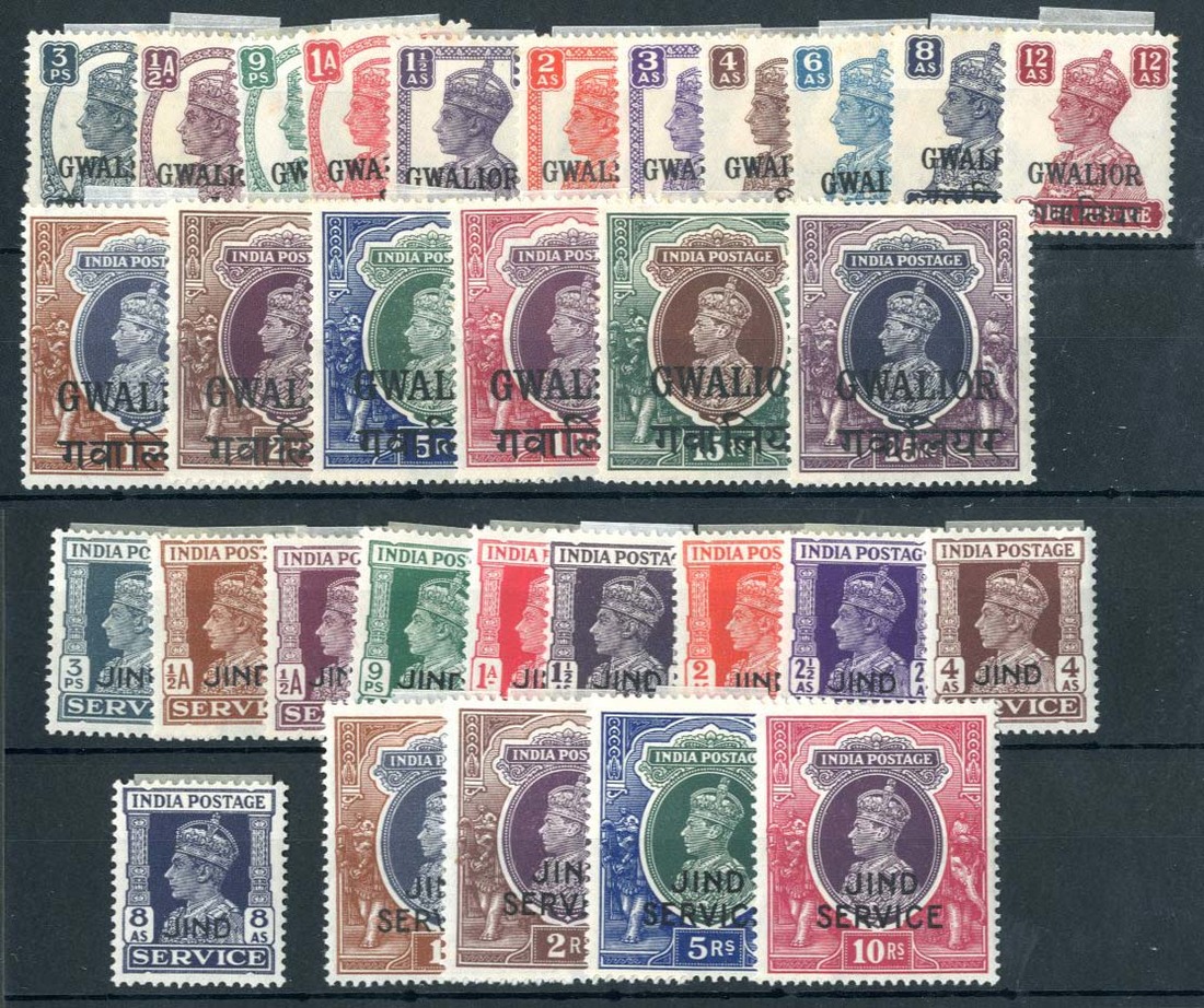 Gwalior: 1938-48 3p. to 25r. and Jind 1939-43 Officials; large part original gum, fresh and fine. S.G. 105-117, O73-O86, £800