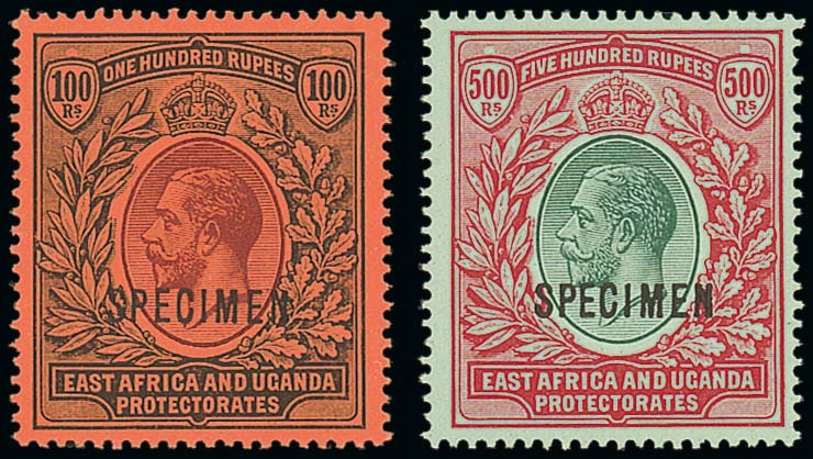 1912-21 100r. purple and black on red, 500r. green and red on green, both overprinted "specimen", fine mint. S.G. 62s, 63s, £1,650. Photo