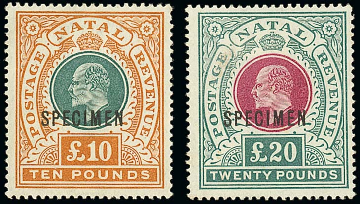 1902 5/- to £20, each overprinted "specimen", large part original gum, fresh and fine. S.G. 140s-145bs, £1,525. Photo