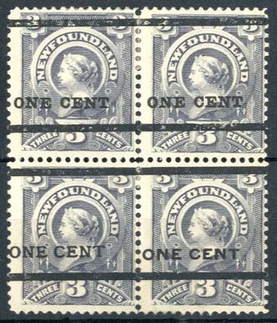1897 1c. on 3c. grey-purple block of four, large part original gum, slightly gum toned, some reinforced perfs, otherwise fine appearance. S.G. 80-82, £860