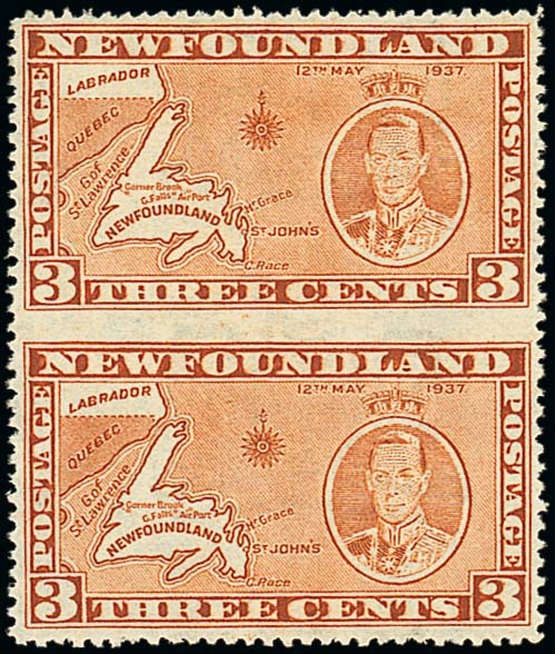 1937 Coronation 3c. orange-brown vertical pair, variety imperforate between, large part original gum, fresh and fine. Murray Payne Certificate (2011). S.G. 258ecb, £750. Photo