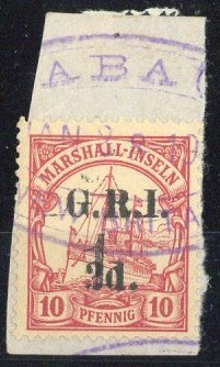 1915 (Jan.) on Marshall Islands, 1d. on 2d. on 10pf., affixed to small piece, neatly cancelled with Rabaul oval datestamp in violet, fine appearance. S.G. 63, £275.