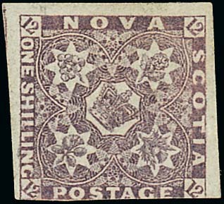 1851 1/- deep purple on bluish paper, large margins on three sides and just cut-into on the fourth, part original gum, small repair at top, fine appearance and an attractive example of this rare stamp. S.G. 7c, £18,000. Photo