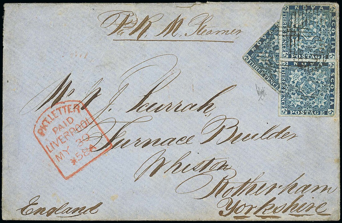 1858 (19 May) envelope from Londonderry to Rotherham via Halifax and Liverpool, bearing 1851-60 3d. deep blue vertical pair and bisect, each with barred oval cancellation, "pkt. letter/paid/liverpool" tombstone d.s. and, on reverse, despatch, transit and arrival datestamps; the envelope is somewhat soiled and the upper stamp of the pair is defective. A scarce cover. Holcombe Certificate (1993). S.G. 2, 2a. Photo