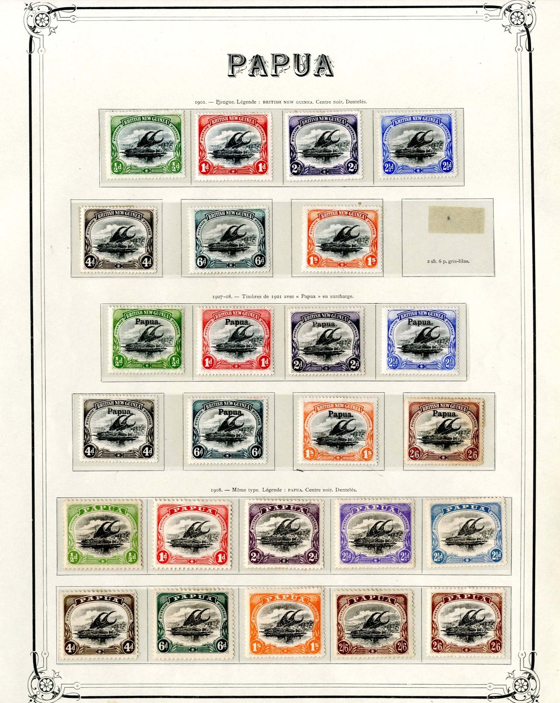1901-31 mint collection on album pages including 1901 BNG values to 1/-, 1906-07 Small and Large Papuas with mixed watermarks, 1907-10 Large Papua ½d. to 2/6d. (mixed perfs and watermarks), 1916-31 Bi-coloureds to 10/-, 1932 Pictorial ½d. to 2/6d. and Officials including 1931-32 ½d. to 2/6d., also a few used; generally fine. Viewing recommended