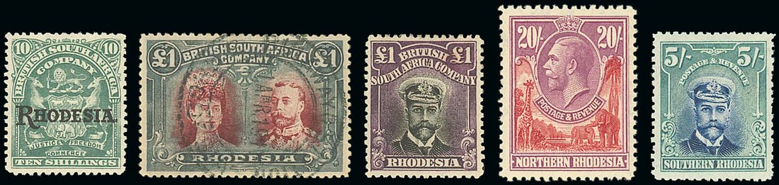 1909-1960 mint and used collection on album pages including Rhodesia 1909-12 ½d. to £2 (used), 1910-13 ½d. to £1 (used), 1913-22 ½d. to £1, Rhodesia and Nyasaland QEII issues, Northern Rhodesia 1925-29 ½d. to 20/-, Southern Rhodesia 1924-29 ½d. to 5/-, 1931-37 ½d. to 5/- and some later issues; generally fine. Viewing recommended. Photo