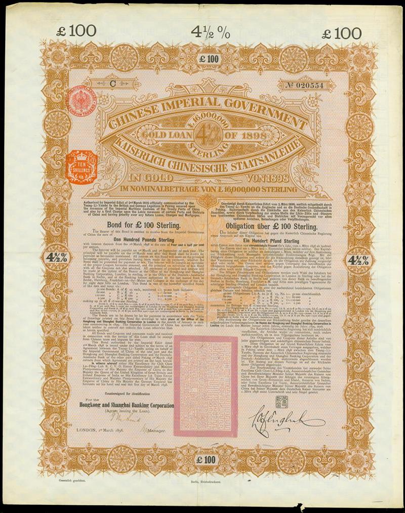 1898 Chinese Imperial Government 4.5% Gold Loan, 6 bonds for 100pounds, large format with ornate floral border, brown on pale blue underprint, large red Chinese seal at bottom centre,