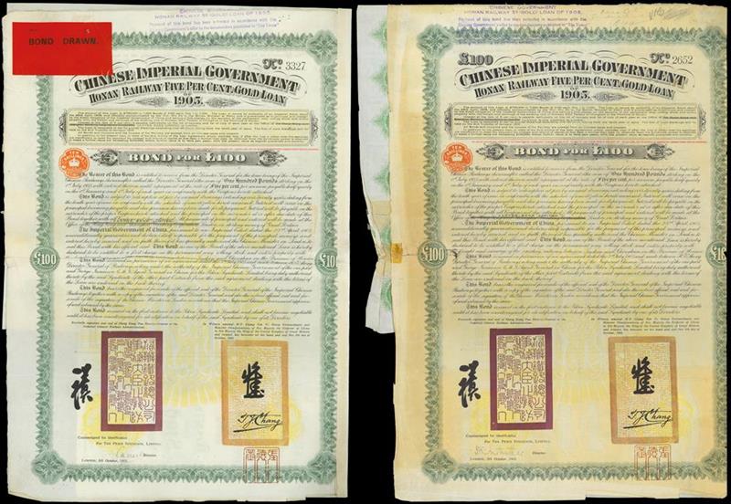 1905 Chinese Imperial Government Honan Railway 5% Loan, pair of bonds for 100pounds, serial numbers 2652 and 3327, large format piece, green and yellow with black English text and coupons, only 7000printed at the time,