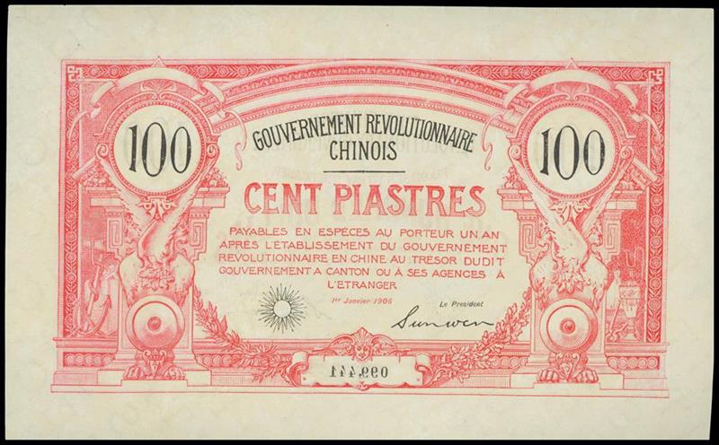 The Chinese Revolutionary Government, $100 bond, Canton, 1 January 1906, serial number 099441, black and red on white, classical designs,English text on obverse, French text on reverse, signature of Sun Wen(Sun Yat Sen), unusual without blue Chinese text stamp on obverse,