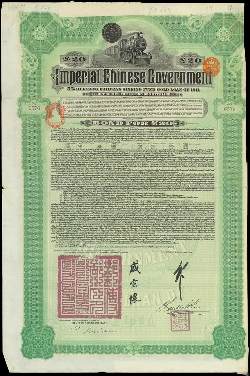 1911 Imperial Chinese Government, 5% Hukuang Railways Gold Loan, group of 5 bonds for 20pounds, issued by Deutsch-Asiatische Bank, large format with vignette of steam train at top, ornate border, green and black, printed by Waterlow & Sons, with coupons,