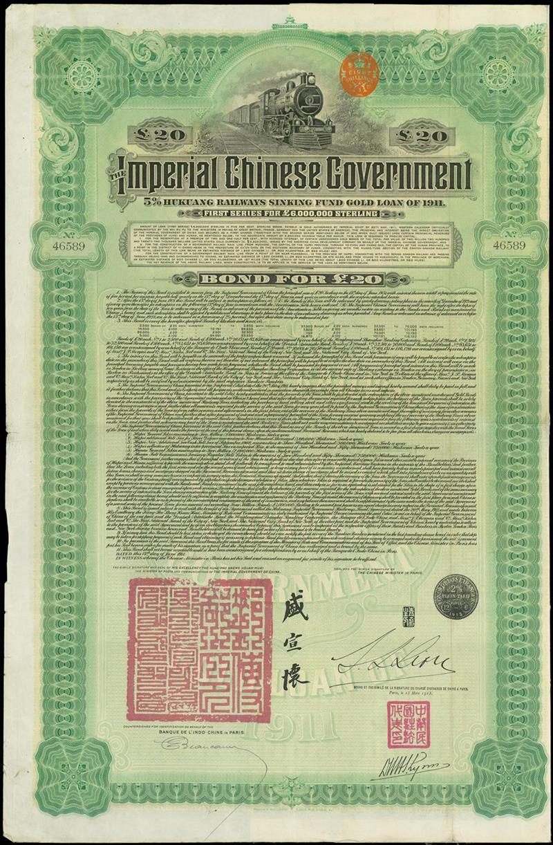 1911 Imperial Chinese Government, 5% Hukuang Railways Gold Loan, group of 3 bonds for 20pounds, issued by Banque de L'Indochine, large format with vignette of steam train at top, ornate border, green and black, printed by Waterlow & Sons, with coupons,