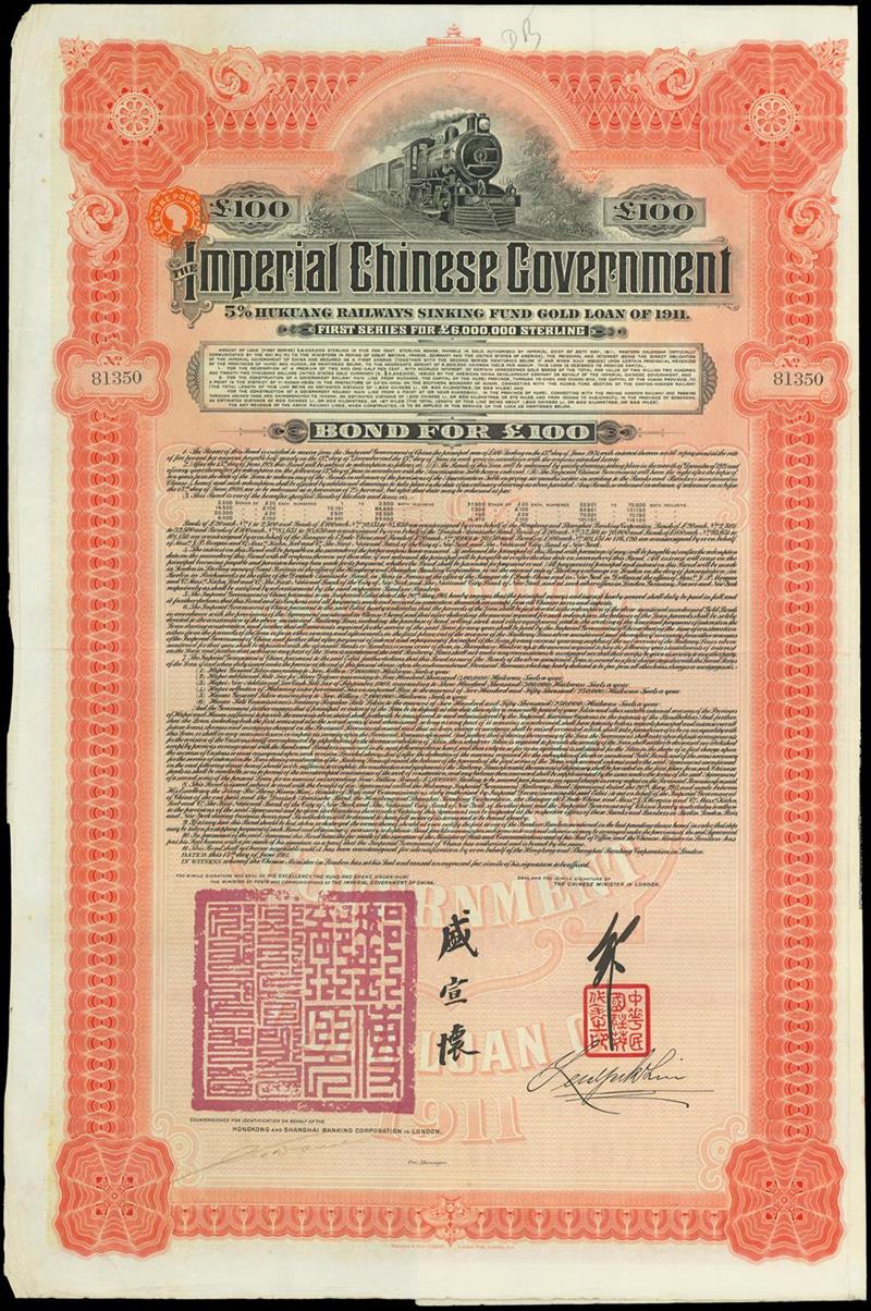 1911 Imperial Chinese Government, 5% Hukuang Railways Gold Loan, group of 6 bonds for 100pounds, issued by HSBC (3) and Banque de L'Indochine (3), large format with vignette of steam train at top, ornate border, red and black, printed by Waterlow & Sons, with coupons,