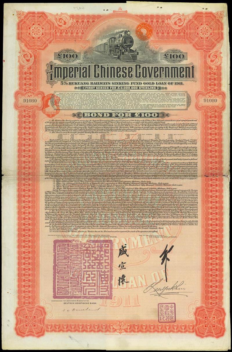 1911 Imperial Chinese Government, 5% Hukuang Railways Gold Loan, group of 5 bonds for 100pounds, issued by Deutsch-Asiatische Bank, large format with vignette of steam train at top, ornate border, red and black, printed by Waterlow & Sons, with coupons,