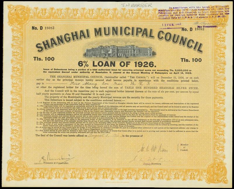 6% 1926 Shanghai Municipal Council Loan, bond for 100taels, serial number D18083, orange and black, neo-classical buildings top centre, handsigned signatures bottom left and right,