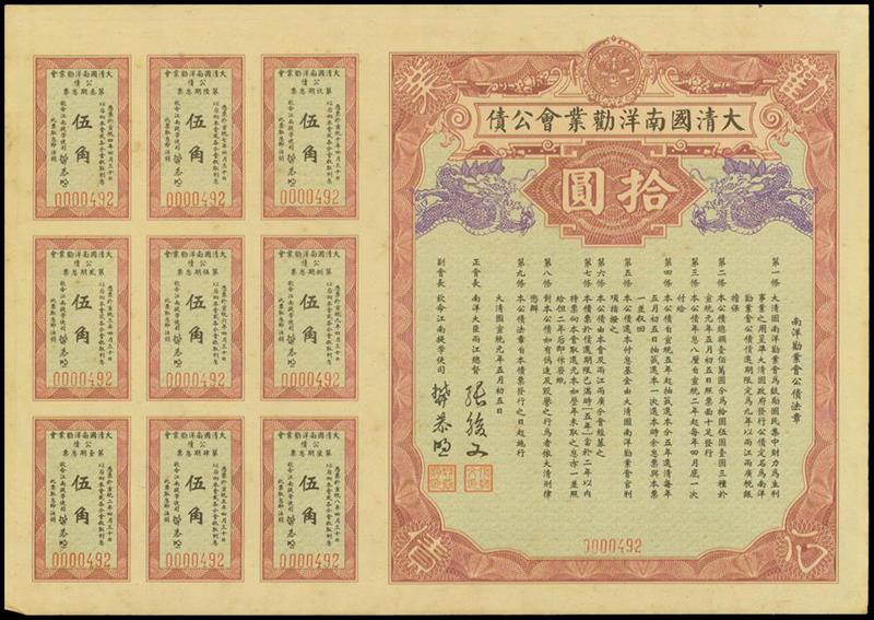 The Great Qing Dynasty Nan Yang Society Loan, bond for $10, 1909, serial number 0000492, brown, green and blue, dragons top left and right,