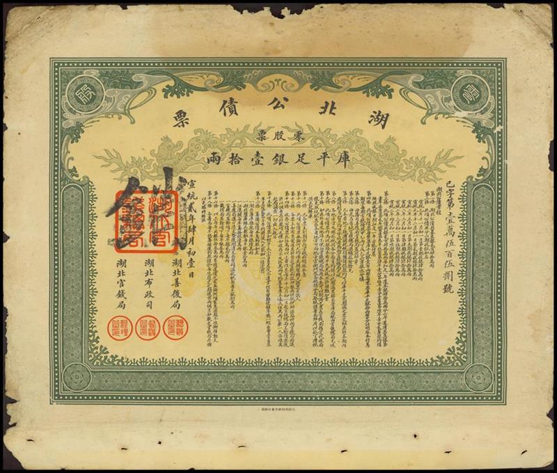 1910 Hupeh Government Bond, 10 Silver tael, number 10558, ornate border, green and black, red seals, ragged edge, pinholes and stains, very fine and very rare.