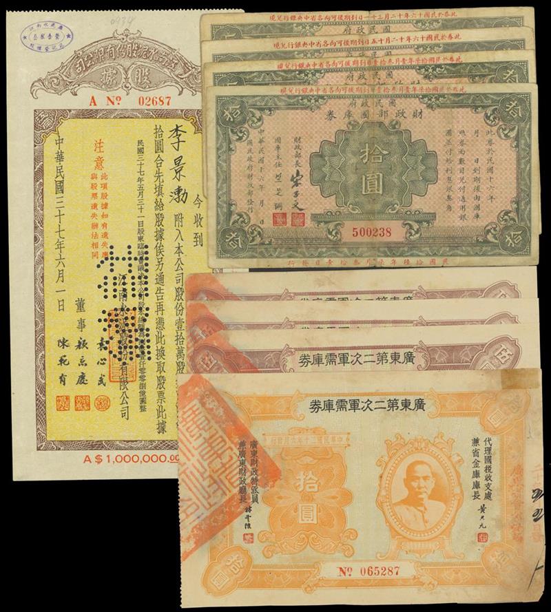Republic of China, a group of 1927 Year 16 Treasury Bond, 10 Yuan(4), 1931 Kwangtung 5% Second Military Supply Loan, 5 Yuan(30), 10 Yuan, small format, fine to very fine, together with a Kiangnan Cement Co., Ltd. , receipt of shares, 1948, vertical format, ornate border, extremely fine.(9) Sold as is, no return.