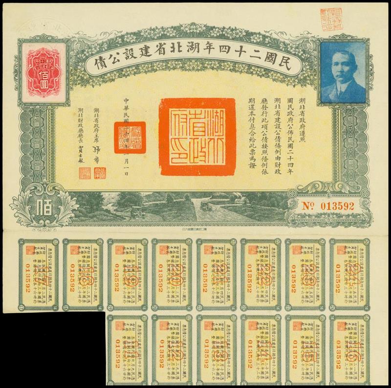 6% 1935 Hupeh Province Construction Loan, bond for 100yuan, serial number 013592, green and yellow, Sun Yat Sen at top right, red revenu stamp top left, motor cars on road at centre,