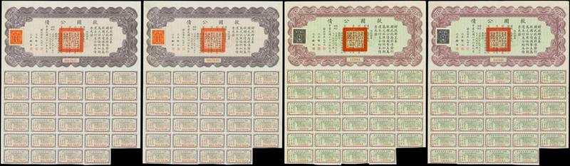 4% Liberty Loan, 1937, group of 4 bonds for 50yuan (2) and 100yuan (2), deep purple and dull red respectively, both with coupons, not cancelled,