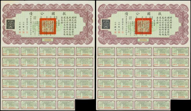 4% Liberty Loan, 1937, pair of 100yuan, pruple and green, black revenue stamp at top left, with coupons, not cancelled,