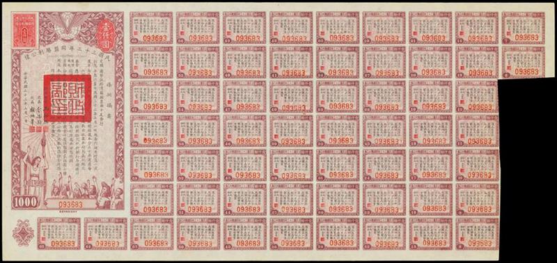 1944 6% Allied Victory Loan, 10bonds for 1000yuan, purple-red, Peace holding a torch at left infront of an adoring crowd, with coupons,