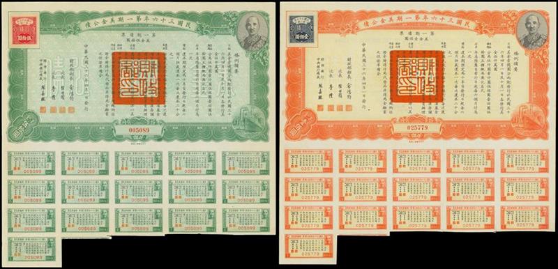 1947 6% U.S. Gold Loan, group of 30 bonds consisting of, 28x $50 and 2x $100, green and orange respectively, Chiang Kai Shek at top right,