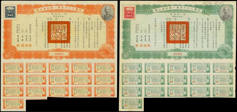 1947 6% U.S. Gold Loan, group of 30 bonds consisting of, 28x $50 and 2x $100, green and orange respectively, Chiang Kai Shek at top right,