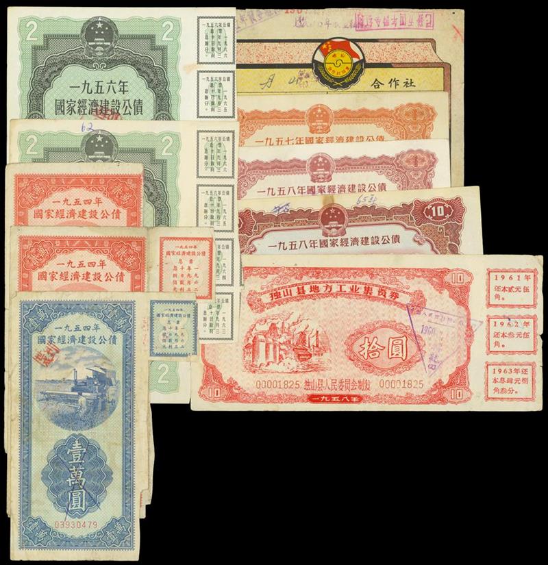 Mixed lot of National Economic Construction Loan, 1954, 10000 Yuan, 20000 Yuan(2), 1956, 2 Yuan(2), 1957, 1 Yuan, 1958, 1 Yuan, 10 Yuan, some with coupons, Du Shan Xian Local Industry Money Raising Coupon, 1958, 10 Yuan and Dan Shan Cooperative certificate of share, 20000 Yuan, 1951, very fine.(10) Sold as is, no return.