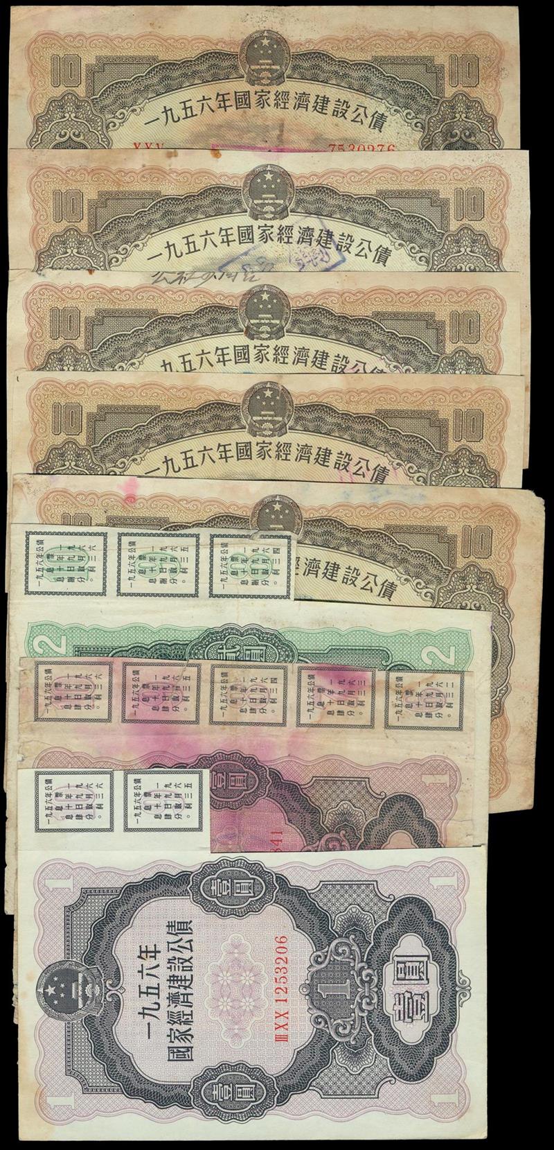 1956 PRC National Construction Loan, lot of 8 bonds, 1yuan (2), 2yuan (1) and 10yuan (5),