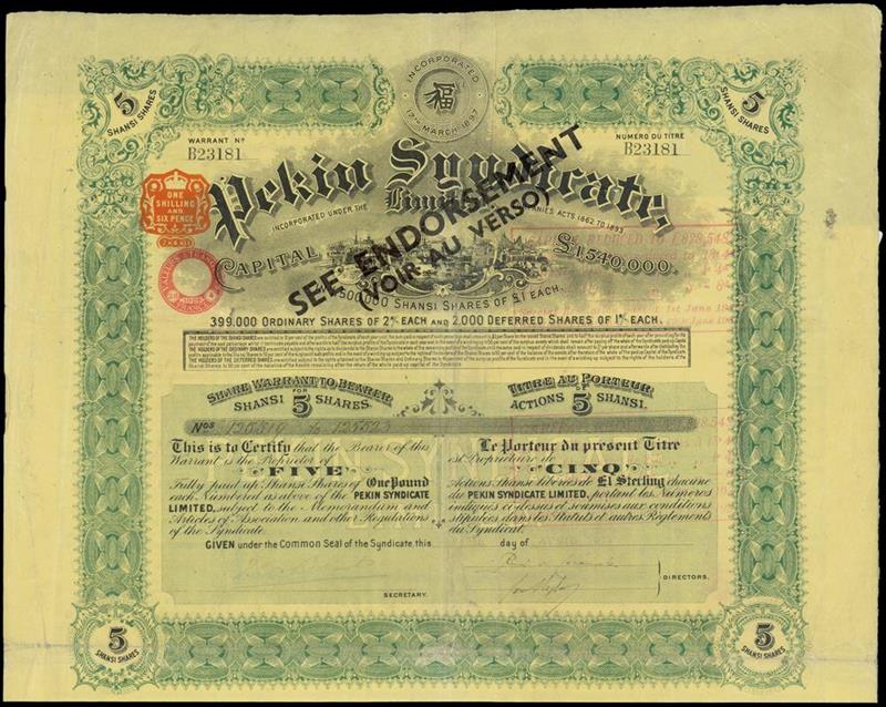 Pekin Syndicate Limited, bearer warrant for 5 shansi shares of 1pound each, 1911, serial number B23181, large format piece, green, yellow and black, vignette of railway and city view at top centre, text in English and French,