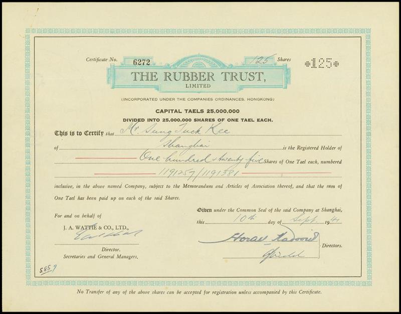 The Rubber Trust, Ltd, group of 5x 1tael share certificates, 1930's - 1940's, blue and black on white, company seal at bottom,