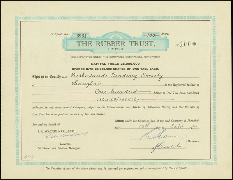 The Rubber Trust, Ltd, group of 5x 1tael share certificates, 1930's - 1940's, blue and black on white, company seal at bottom,