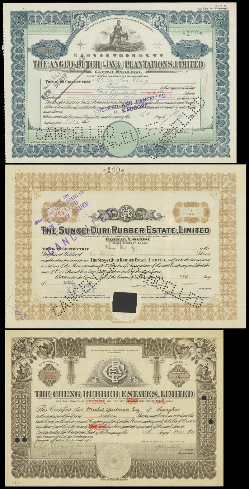 Rubber Companies in South East Asia, group of 3 share certificates, The Anglo-Dutch (Java) Plantations Limited, The Cheng Rubber Estates Limited, The Sungei Duri Rubber Estate Limited,