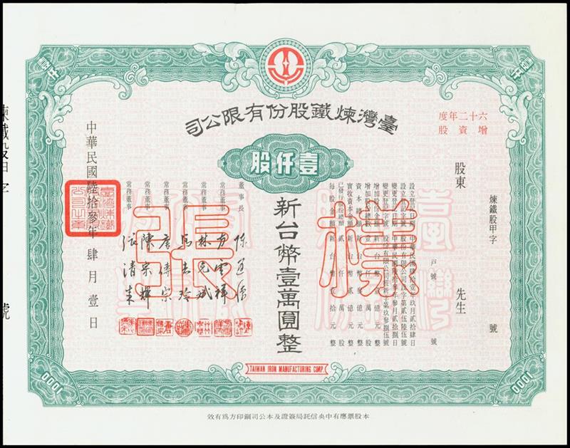 Taiwan Iron Manufacturing Corporation, 'specimen' share certificate for 1000 shares of 10yuan, 1974, ornate border, green and pink, black Chinese text on pink underprint with counerfoil,