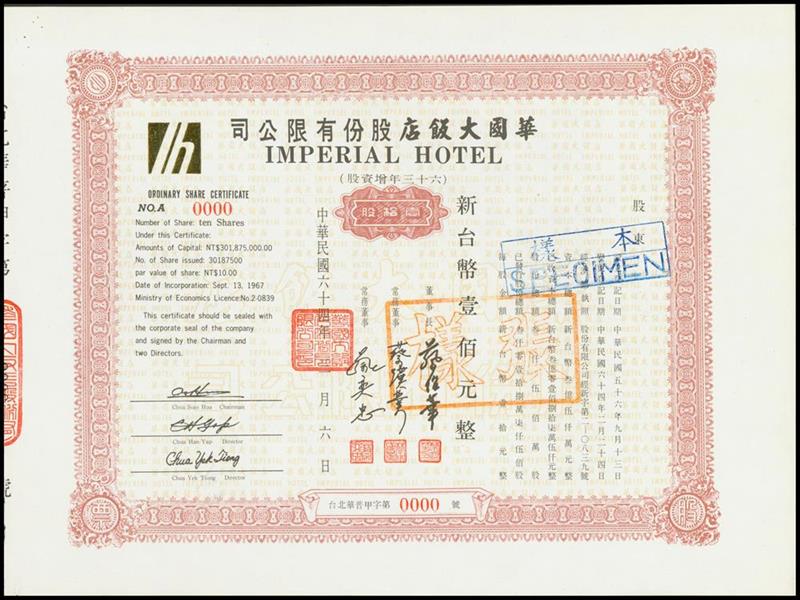 Imperial Hotel, specimen certificate for 10 shares of 100yuan, 1975, ornate border, brown and black, gold monogram top left, various seal signatures and handstamped 'specimen' in Chinese and English,