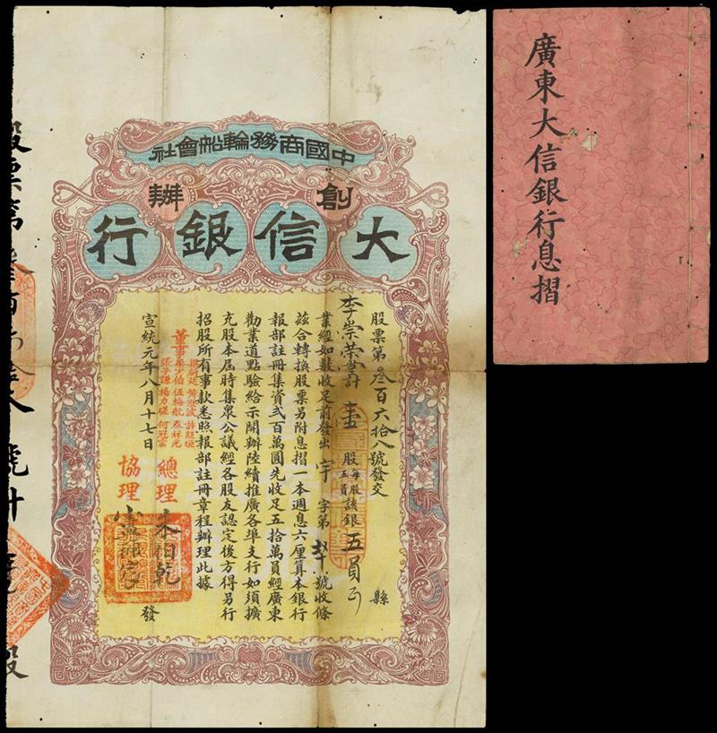 Kwangtung Da Xin Bank, share certificate for $5/share, 1909, established by the Chinese Mercantile Shipping Company, purple, blue and yellow, black Chinese text, ornate borders, names of the board member in red, signed by the General Manager at bottom left, plain white reverse, also comes with the matching dividend book,