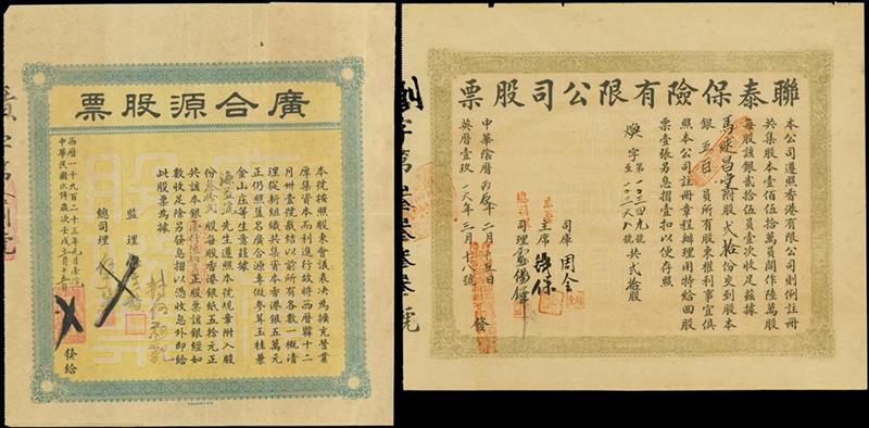 Lun Tai Mutual Fire and Marine Insurance, certificate for $25 shares, 1916, olive green on orange, black Chinese text, various red seals, also share certificate from Guang He Yuan, certificate for $50 shares, 1932,