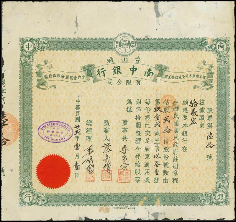 Bank of South China Ltd., Toy Shan City, certificate of shares, 1933, number 60, ornate border, green on yellow underprint, red seals, all text in Chinese, English bank name in blue oval stamp, ragged edges, heavy fold and repaired, very fine and very scarce private bank's share certificate in Southern China before WWII.