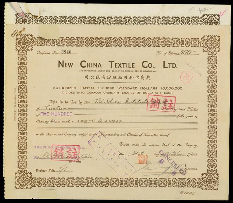 New China Textile Co., Ltd., 2 certificates of $5 shares, 1940 and 1941, number 3940 and 7277, ornate border, brown on white paper, text in English, Chinese company name, repaired and clip rusted, very fine to extremely fine,(2). Sold as is, no return.