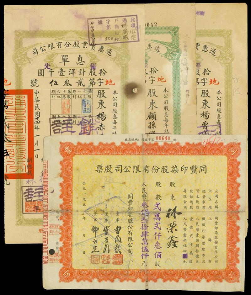 Tung Fung Printing and Dye Co., Ltd., certificate for 22300 shares of 150 Yuan, 1955, ornate border, red on yellow underprint, heavy folded, repaired, good fine, together with 3 dividend receipts of Tung Wei Enterprise Co., Ltd., all with revenue stamps, fine to very fine.(4) Sold as is, no return.