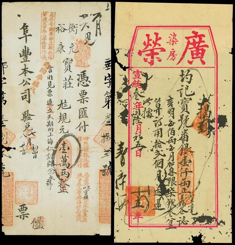 Private issue including Fu Feng Co, receipt of transfer, 10000 tael, black on white, lots of red chops, and Guang Rong Dyer, certificate of saving, 1000 tael, 1911, red and black on white,red chops, both with insect holes, fine to very fine.(2)