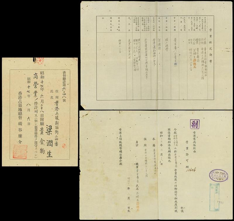 Commerical License under the Japanese Occupation of Hong Kong, a pieces of documentation issued to allow a Mr. Leung Tak Sing to sell jade and precious metals at an address in Sheung Wan, the other two documents concerns about the nature of the business, the capital (200 military yen), the owner's residential address and place of birth, approved by the Japanese Governor of Hong Kong, Rensuke Isogai, who served from 20th February 1942 to 24th December 1944,