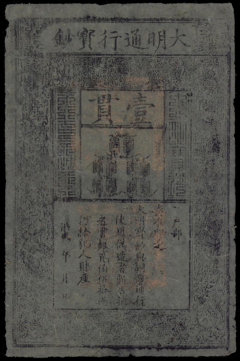 Ming Dynasty, Da Ming Bao Chao, 1kuan, 1368-1399, black text on grey mulberry paper, red rectangular seals top and bottom, 10strings of cash at centre,