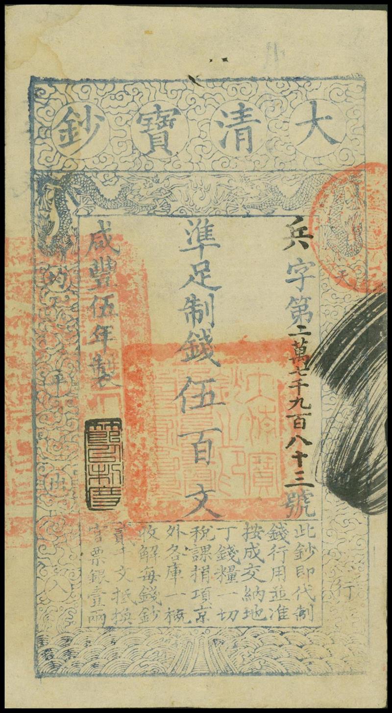 Qing Dynasty, Da Qing Bao Chao, 500cash, Year 5 (1855), 'Bing' prefix number 27983, vertical format, blue on white, dragons at top, large red Chinese handstamps on obverse,
