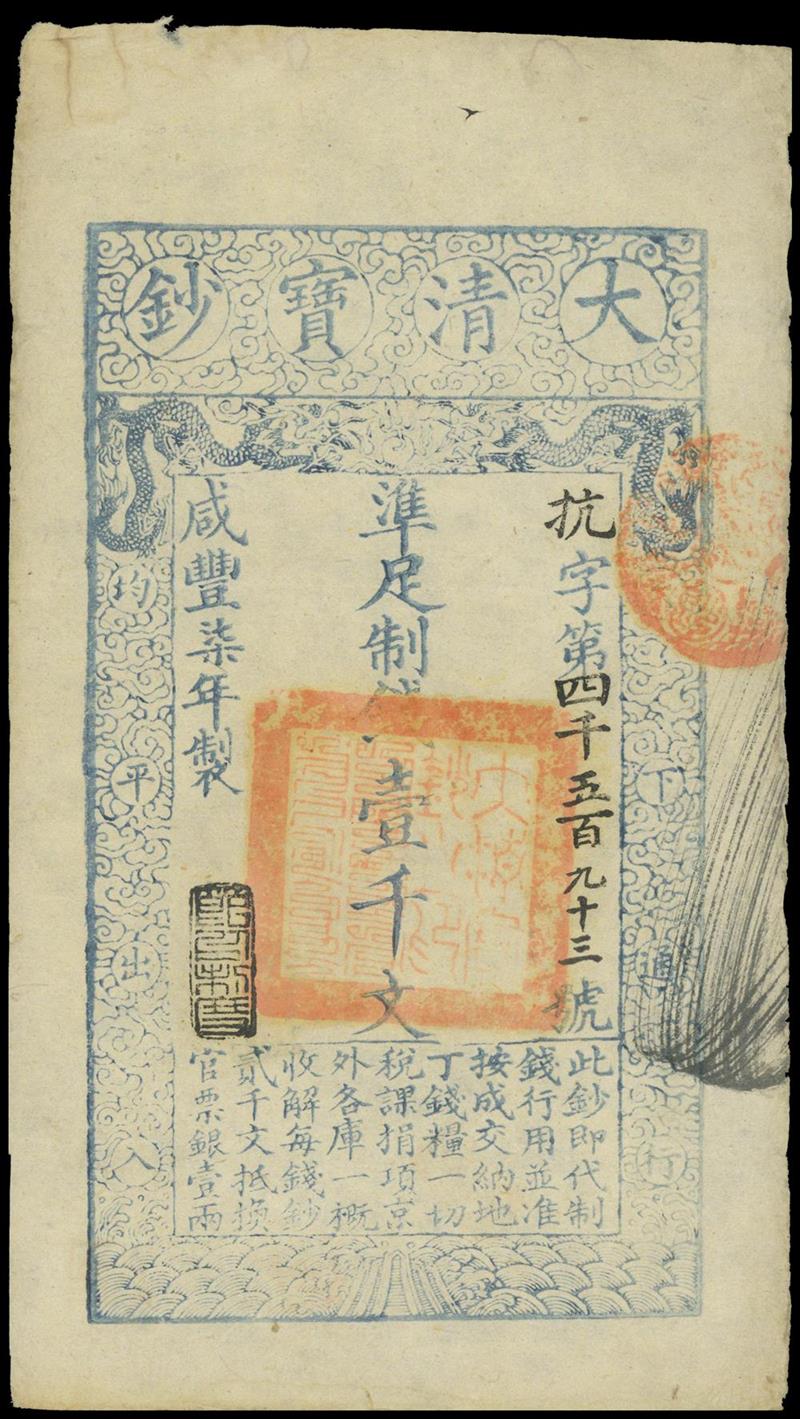 Qing Dynasty, Da Qing Bao Chao, 1000cash, Year 7 (1857), 'Kang' prefix number 4593, vertical format, blue on white, dragons at top, large red Chinese handstamps on obverse,
