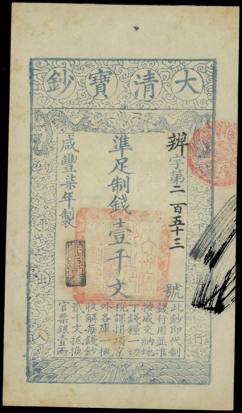 Da Qing Bao Chao, 1000cash, Year 7 (1857), Bian prefix number 253, vertical format, blue on white, dragons at top, large red Chinese handstamps,